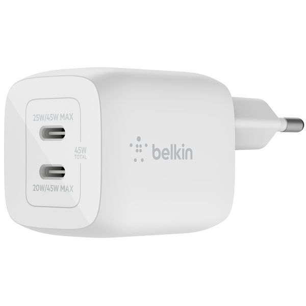 De lader is uitgerust met twee USB-C poorten, wat ervoor zorgt dat je meerdere apparaten tegelijkertijd kunt opladen. Hierdoor kan je zowel je telefoon als tablet van stroom voorzien. Op het moment dat je twee apparaten tegelijk oplaadt wordt de 45 Watt over beide poorten verdeeld.