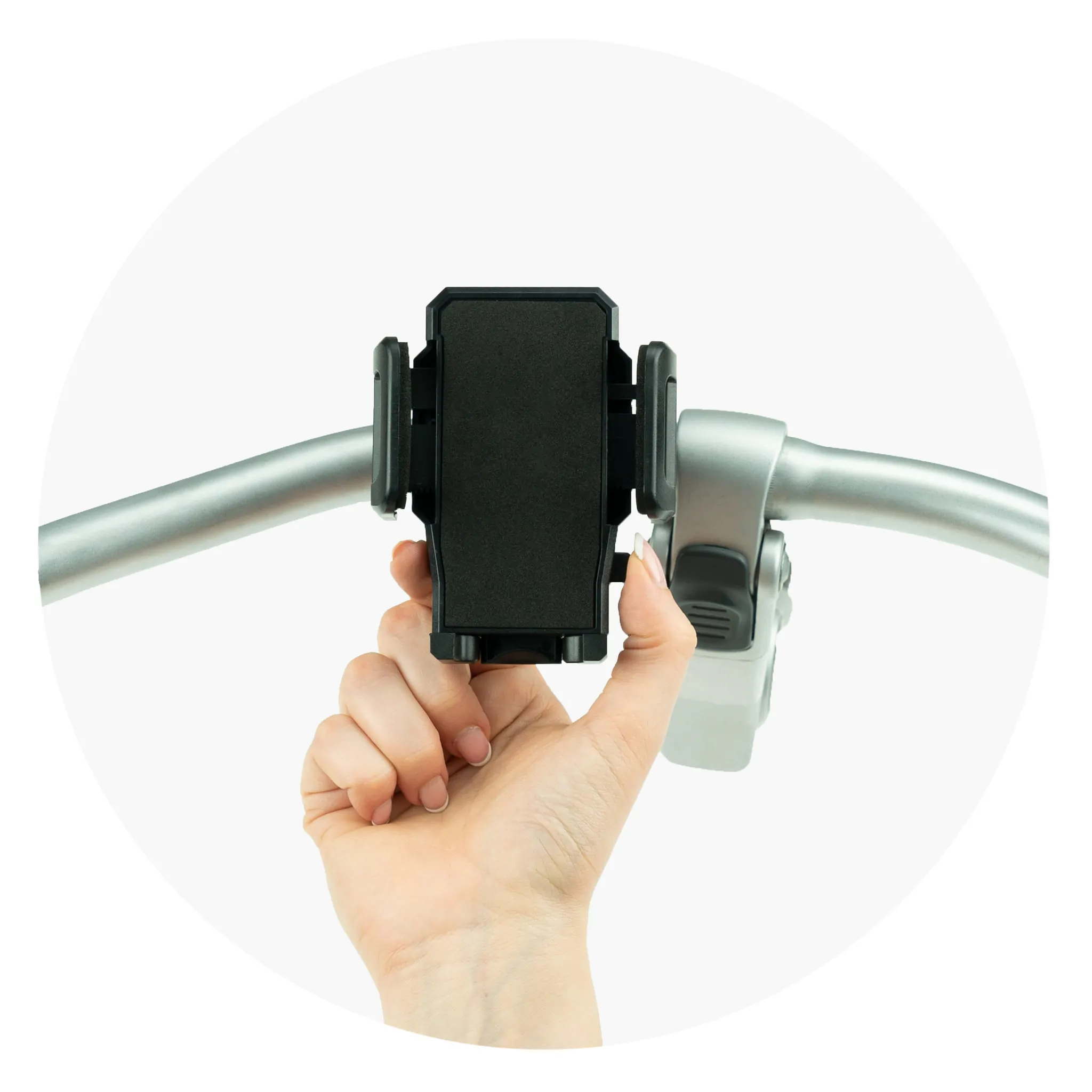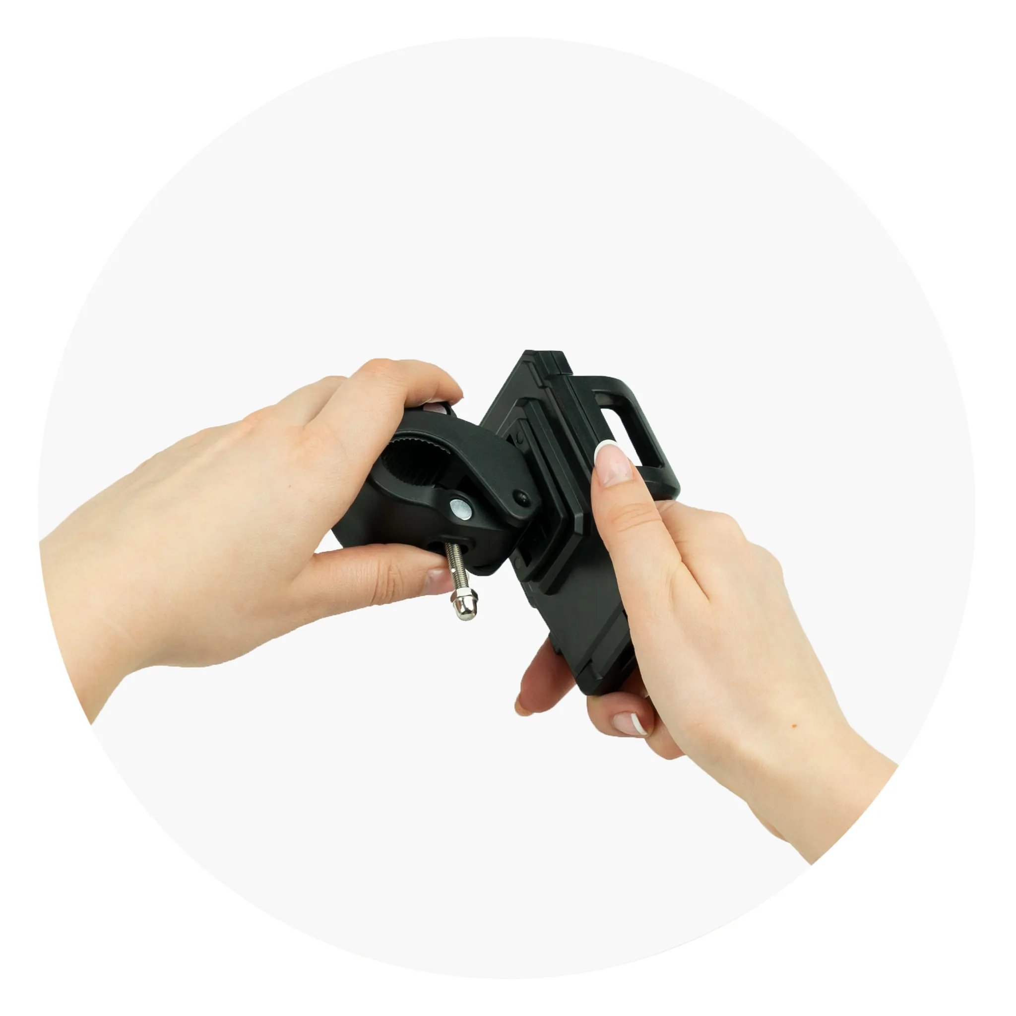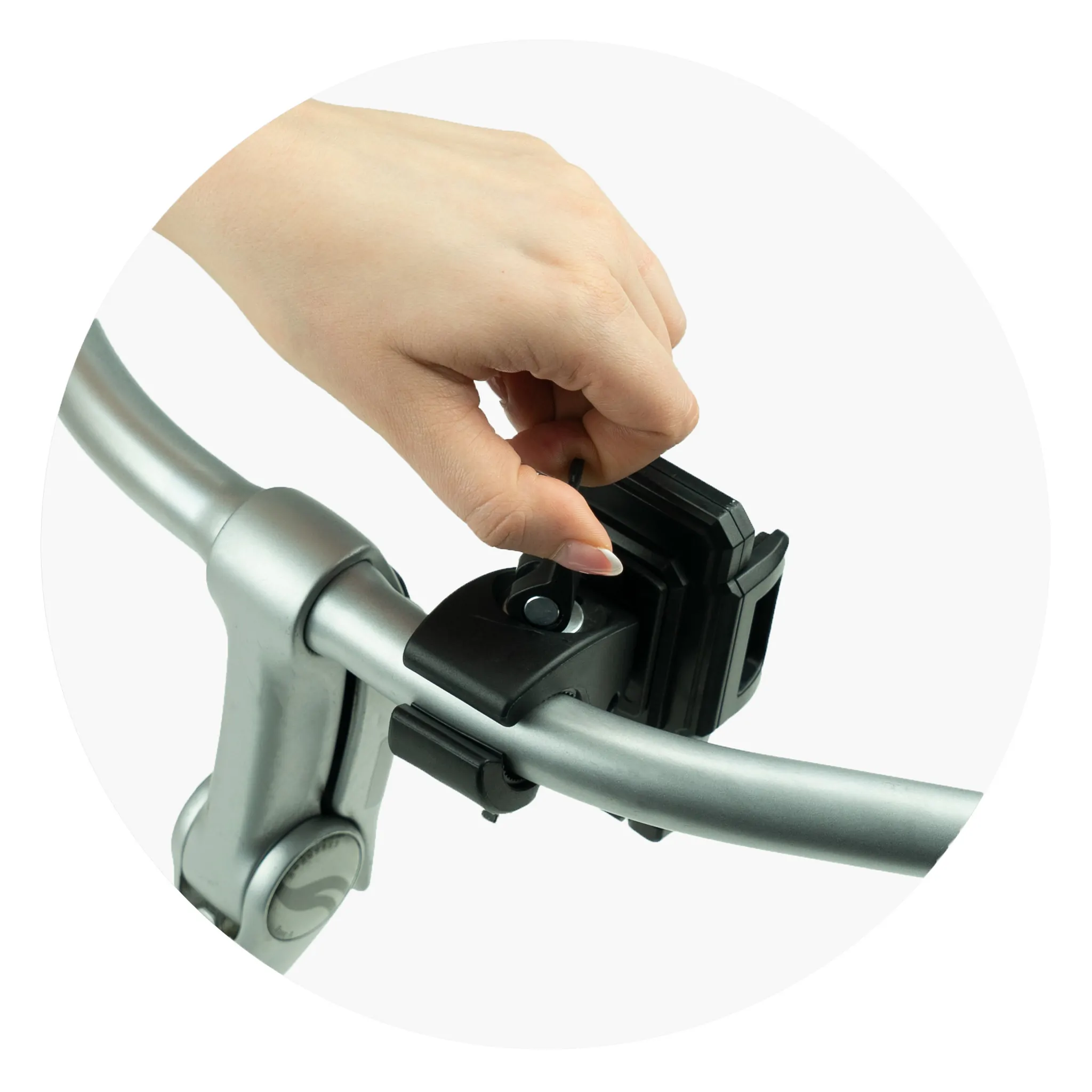Bevestig de houder op de gewenste positie op het stuur van je fiets. Draai vervolgens aan het zwarte hendeltje aan de onderkant totdat de houder stevig op zijn plek zit. Druk het zwarte hendeltje omhoog, zodat de houder stabiel bevestigd is.