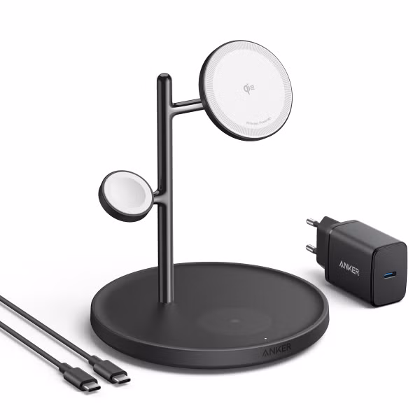 Anker MagGo | Standaard 3-in-1 Magnetische draadloze oplader - 15 Watt - Geschikt voor MagSafe en Qi2 - Zwart