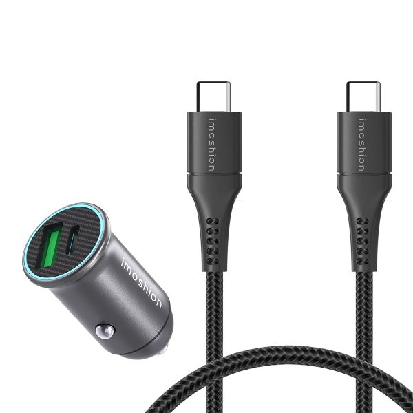 imoshion Mini autolader 2 poorten - Quick Charge - Power Delivery - 60 Watt + Braided USB-C naar USB-C kabel - 1 meter - Zwart