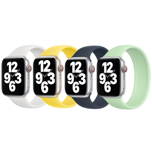 Apple 4 Pack Siliconen solobandje voor de Apple Watch | 44/45/46/49 mm - Maat 8 - White / Canary Yellow / Storm Blue / Pistachio