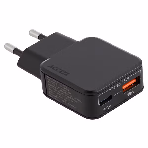 Accezz Ultra Slim GaN Oplader - USB-C + USB-A - 30W - Zwart