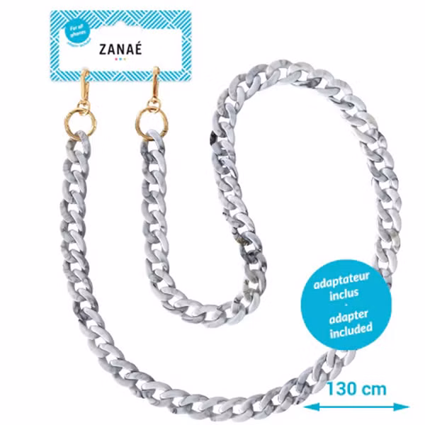 Maak van jouw telefoon een echte eyecatcher dankzij het universele telefoonkoord van Zanaé! De grote schakels van het koord geven jouw telefoon een fashionable uitstraling, super leuk om je outfit mee af te stylen. Bovendien hoef je je dankzij het koord geen zorgen meer te maken over het verliezen van je telefoon en heb je deze altijd binnen handbereik. Het koord heeft een lengte van 130 cm, hierdoor heb je nog voldoende bewegingsvrijheid om je telefoon te gebruiken terwijl je het koord draagt. Bovendien is het koord universeel te gebruiken met alle hoesjes die beschikken over een dichte onderkant.