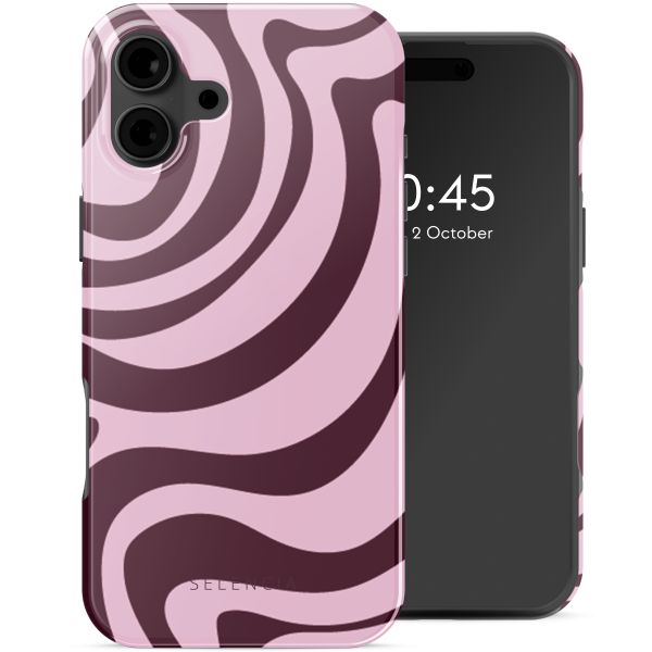 Bestel de Selencia Vivid Backcover met MagSafe en geef je iPhone 16 direct een opvallende look en betrouwbare bescherming. Kies jouw Wavy Swirl Pink Plum design en ervaar het gemak van MagSafe.